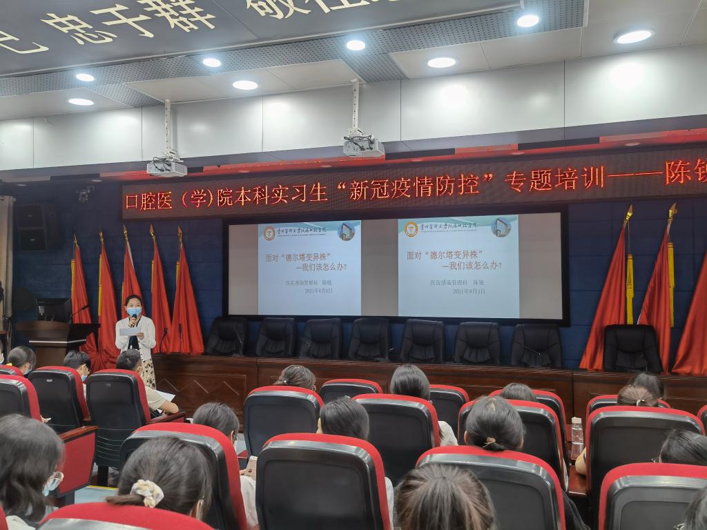 近期,境外输入引发的本土聚集性疫情已先后波及多个省份,新冠病毒“德尔塔”变异毒株正在国内快速扩散。当前正值暑期,公司就诊病人量增加,医院作为特殊场所,口腔诊疗又具有操作特殊性,疫情传播风险进一步增大。为提高实习同学疫情防控意识,强化其理论知识,进一步做好新冠肺炎防控工作,有效控制和降低疫情传播风险,8月4日,生产实习科联合院感科为本科实习生进行“新冠肺炎疫情防控”专题培训。培训由院感科负责人陈锐主讲,生产实习科科长胡睿主持,全体本科实习生参加培训。