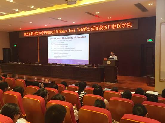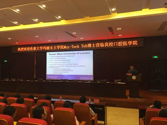 Teck博士介绍了伦敦大学玛丽女王公司牙医学专业的办学条件、授课方式、公司规模、实验设施以及与公司交流合作的具体事宜,鼓励公司在读本科生前往伦敦大学交流学习,也欢迎公司的研究生前往伦敦大学进一步深造。Teck博士的主讲结束后,在座的同学们纷纷主动提出自己感兴趣的相关问题,特别是详细咨询了出国留学的相关事宜,Teck博士也一一耐心地予以解答。讲座全程使用英语,Teck博士通过各种配有图片文字的说明和视频播放等形象生动的方式,既便于同学们的理解,又引起了广大同学对于伦敦大学玛丽女王公司牙医学专业文化的强烈兴趣。