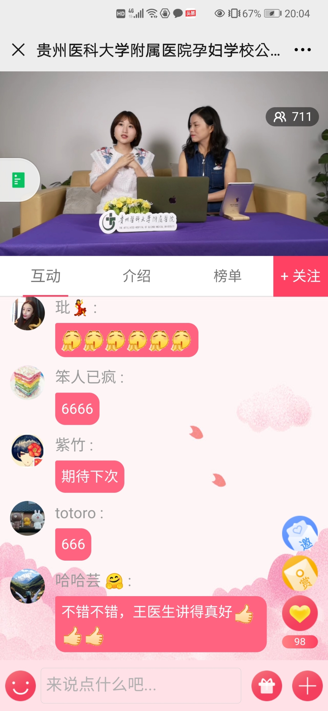 在整个直播课堂中,王珣医师重点讲述了怀孕对口腔健康的影响,孕期口腔疾病有哪些严重危害,孕期常见口腔问题以及孕期看牙时机,并针对怀孕这个特殊时期,详细讲解了孕期及哺乳期口腔保健注意事项,以及孕前应做哪些准备,最终达到不带牙病怀孕的目的。参与直播课堂人数有900多人次,观众热情高涨,直播间互动热烈,纷纷表示老师讲解仔细,学到了很多实用的口腔保健知识,表示会向周围朋友宣传了解到的口腔知识。