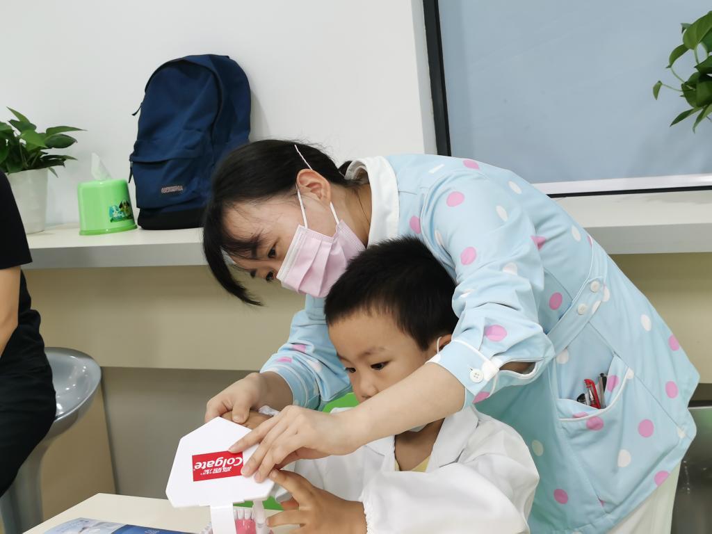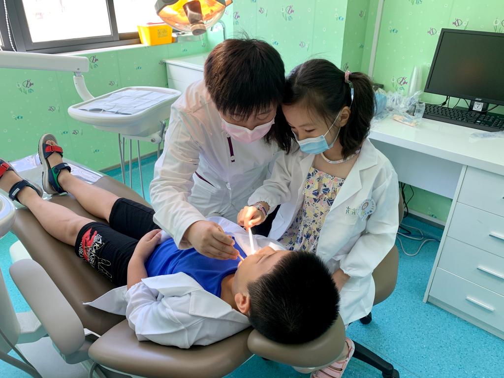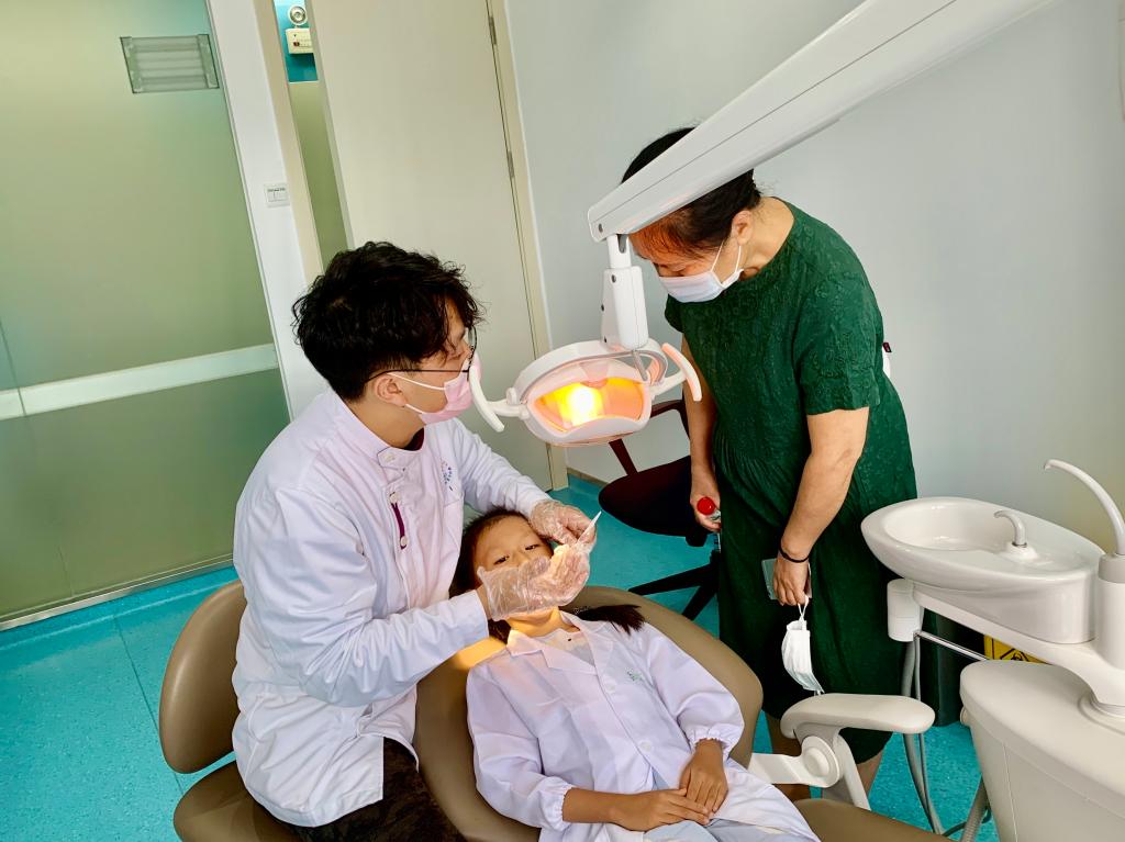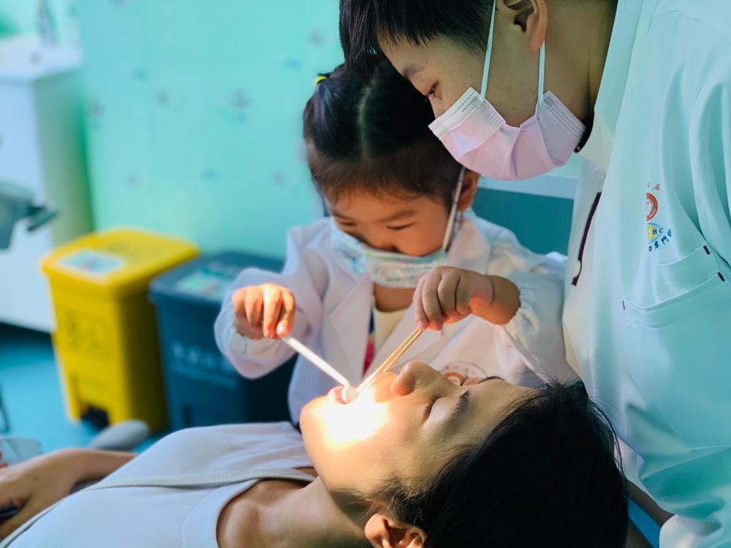 讲座后,医护人员安排小朋友有序进入口腔诊室进行口腔全面检查,用简明易懂的语言讲解口腔检查情况,给出针对性的口腔诊疗建议,同时教会家长如何在平时生活中注意孩子口腔卫生情况以及进行口腔检查。口腔健康检查中还设计了亲子活动环节,医护人员指导小朋友对家长进行口腔检查和诊疗互动,通过让小朋友体验当“小牙医”的切身感受,加强小朋友们的牙齿保健意识,消除小朋友们看牙的恐惧心理。最后,医护人员安排小朋友有序进行牙齿涂氟防龋,并颁发“牙科小卫士”奖状,以资鼓励。