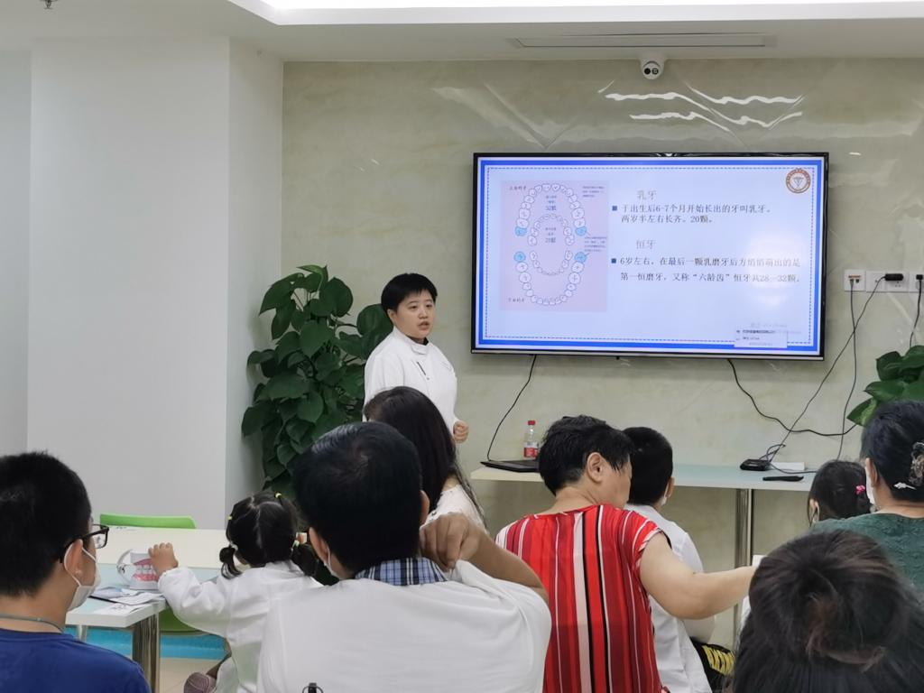 深圳分院医护人员分别对来院的小朋友及家长进行签到和体温检测记录,并为小朋友穿上白大褂。此次专题科普讲座的主题是儿童口腔健康管理,主要包括对口腔及牙齿的认识、儿童龋齿的危害、儿童口腔健康管理要“三早”、正确的刷牙方法等,由主治医师李惠兰主讲。讲座现场,通过使用牙模型示范,让小朋友学习正确的刷牙方法,之后给家长演示,在寓教于乐的氛围中,让孩子们重视口腔卫生,懂得如何有效保护牙齿。