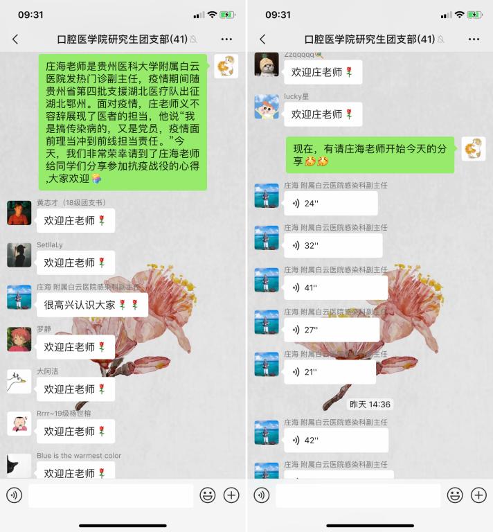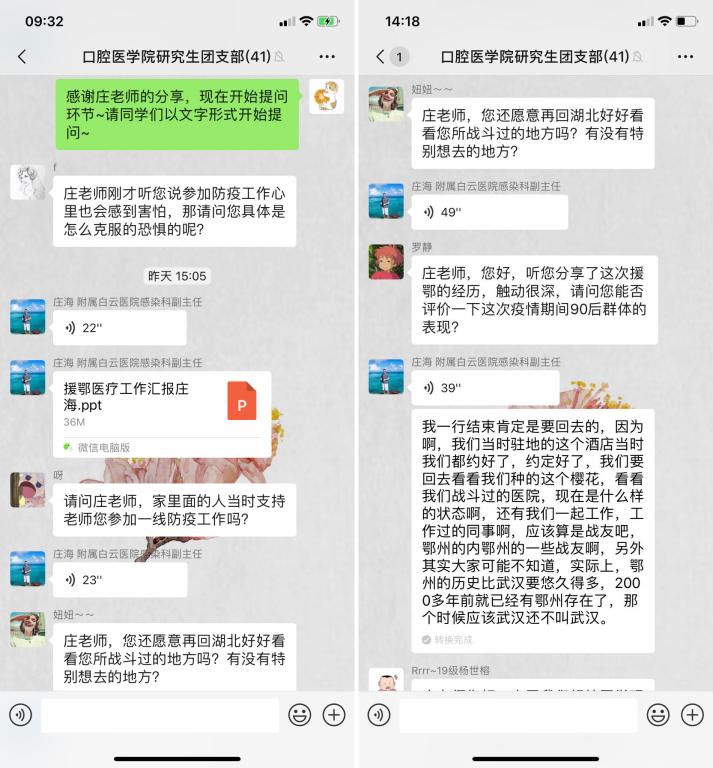 在此次团日活动中,公司邀请了3044永利集团附属白云医院感染性疾病科的庄海老师与各位研究生团员共上一堂 “云课堂”思政课。庄海老师曽随贵州省第四批支援湖北医疗队出征湖北鄂州,他分享了在武汉抗“疫”一线的所见所闻所感。公司团员们虽然未能直接参与这场惊心动魄的没有硝烟的战斗,但是通过庄海老师的分享,大家都真真切切地感受到了疫情的残酷,更加体会到广大战“疫”一线医护工作者的伟大。怀着对庄海老师的关心及敬意,团员们纷纷提出了心中对此次疫情及医护相关的问题,庄海老师一一做了细致的解答。聆听过庄海老师的战“疫”故事后,同学们收获良多,大家踊跃发言分享自己在此次主题团日活动中的感受,表达了对庄海老师以及所有抗“疫”一线工作人员的感谢和尊敬,对抗“疫”战斗彻底胜利的期待以及通过自身行动助力抗疫的决心。
