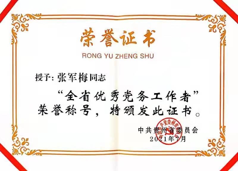 根据省委办公厅《关于举行贵州省庆祝中国共产党成立100周年有关活动的通知》(黔办发电〔2021〕28 号)安排,7月2日,贵州省庆祝中国共产党成立100周年活动召开,全省“两优一先”表彰大会在遵义举行,公司党委书记张军梅被授予“全省优秀党务工作者”称号。