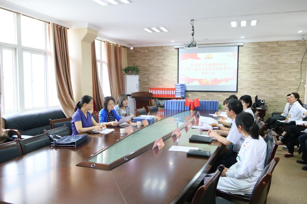 检查组一行首先参观了“一领域一载体”的医公司党建标识区域,先后走访颌面外科、口腔修复种植科、口腔正畸科、口腔综合急诊科“一支部一特色”的党建活动室、医院门诊、病房。并在医院行政楼五楼会议室召开党的建设绩效考核工作汇报会。党委书记张军梅参加并主持会议。检查组听取了医院党委关于党建工作的情况汇报。随后,省卫健委检查了《贵州省三级公立医公司党的建设绩效考核指标体系》的落实情况、党建工作写入医院章程,对公立医院院级党委会议、党委会议议事规则的修订和执行情况、设立党委的公立医院实行党委书记、经理分设落实情况、党管干部党管人才、基层党组织建设、医院文化与医德医风、民主管理、院工会共青团统战工作、党建活动经费及党员活动场所建设、党委书记抓党建述职评议考核等情况。