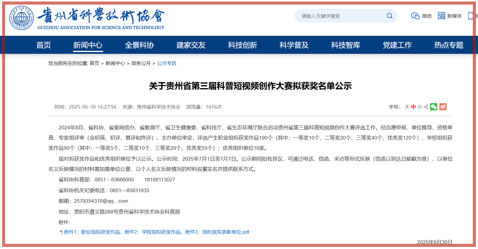 6月30日,贵州省科学技术协会发布《关于贵州省第三届科普短视频创作大赛拟获奖名单公示》,公司3部作品在职业组竞赛中脱颖而出,荣获佳绩!