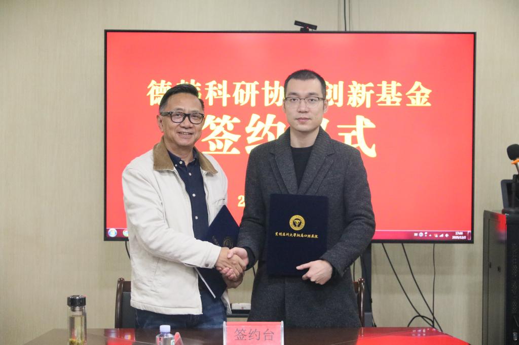 12月2日,公司与德韩口腔集团在综合会议室举行横向课题科研合作签约仪式,并共同设立“德韩科研协同创新基金”,推动双方在科研协作与人才培养方面的深入合作。德韩贵州片区总经理林远达、德韩集团医疗总监兼贵州片区医疗经理王胜、德韩贵州片区花果园机构医疗经理杨童景;公司党委副书记、经理马洪,党委委员、副经理唐正龙、董强、廖健及科室主任代表、课题负责人和科研团队代表共同参加签约仪式。