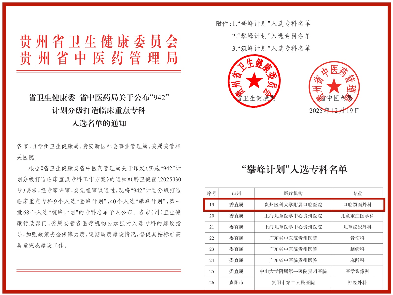 口腔颌面外科入选“942攀峰计划”重点专科