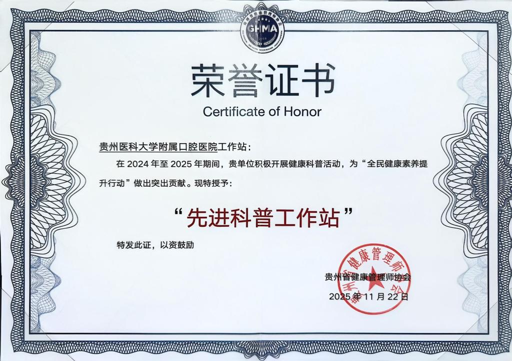 这一年,我们始终坚守公益属性,积极响应“健康中国”战略,将人民口腔健康置于首位,以社会责任为己任,组织开展口腔健康宣教与公益诊疗,将关爱送至千家万户。全年开展义诊宣教活动36次;录制宣发“爱牙说”科普视频17期;开展“青春志愿爱在口腔”口腔志愿服务活动8次;积极参与并支持乡村振兴工作,派遣专人进驻毕节市七星关区海子街道七里沟村,领导干部定期实地调研、助力当地发展。在贵州省科协“科学家(精神)进校园行动”项目中获专项经费支持,科普专业能力获认可;作为贵州省健康管理师协会全民健康素养提升科普教育基地工作站,表现突出,荣获“先进科普工作站”称号。