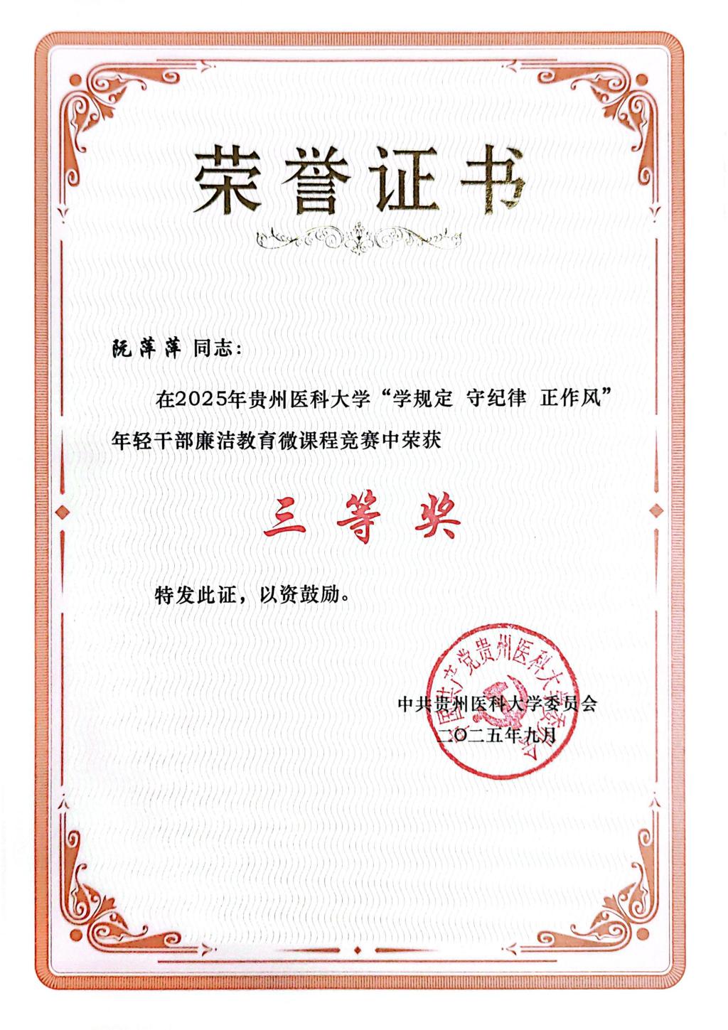 参与“学规定 守纪律 正作风”年轻干部廉洁教育微课程竞赛并获三等奖