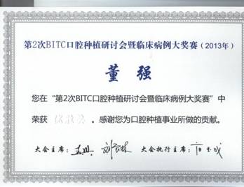 2013年8月18日,在上海举行的“第15次全国口腔医学学术会议”期间, “全国第二届BITC口腔种植研讨会暨临床病例大奖赛”同期举行,来自全国各大口腔院校、各省市口腔医院及港、澳、台地区的口腔种植医生踊跃参赛,大赛邀请中华口腔医学会王兴会长,国际牙科医师公司院士、中华口腔医学会副会长王大章教授,第四军医大学刘宝林教授,北京大学口腔医院冯海兰教授等12名国内知名专家教授作为评委,经过激烈角逐,在西部地区10个省份的3044永利集团校中,有贵阳医公司3044永利集团、四川大学华西3044永利集团和重庆医科大学3044永利集团的参赛病例获奖。公司修复科董强博士的参赛病例:“双侧上颌中切牙的种植修复”获得优胜奖,并被国内第一部种植病例专业论著《中国口腔种植临床精粹——2013年卷》(人民军医出版社出版,2013.8.第一版)收录出版,该病例poster在中华口腔医学会年会展区和BITC口腔种植研讨会展区同时展示交流。BITC口腔种植大奖赛是目前国内参与人数最多、影响最大、专业水准最高的口腔种植专业比赛,此次也是贵州口腔种植临床治疗病例首次在全国大赛中获奖。董强博士的参赛病例是一例美学区缺牙缺骨病例,利用引导骨再生(GBR)同期植入种植体技术,获得满意的前牙美学修复效果,向全国各地的口腔种植专家展现了公司口腔种植治疗新技术的开展情况,同时获得了业界的肯定。