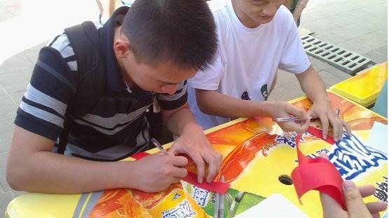 我们已准备好500条红带子,有专人负责发送笔,大家可以自由写出自己心中对父亲想说的心里话,并由我们工作人员统一系在“感恩父亲树”上。
