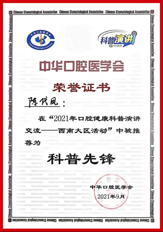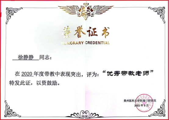 五年间,护理团队依靠扎实的理论基础、专业的服务技能,曾多次荣获各项荣誉、称号,其中曾有护理人员在“贵阳市医疗卫生临床技能竞赛”荣获藻酸盐印模材料调拌技术比赛一等奖、玻璃离子水门汀调拌技术比赛二等奖,王蕾曾荣获医院“优秀护士长”称号,徐静静曾荣获医院“优秀带教老师”称号,陈代凤曾获得“5·12”国际护士节口腔科普演讲比赛二等奖……