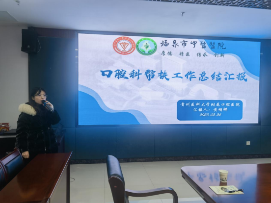 贵医口腔帮扶团队医师黄明娜围绕“诊疗技术、人员培训、新技术新业务”等方面的开展情况对2022年帮扶工作进行汇报并做工作交接。双方医院均对一年的帮扶成效表示认可。
