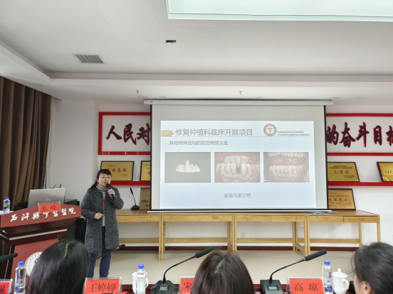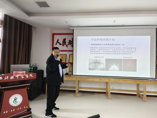 讲座于上午9时在石阡县中医医院13楼会议室举行,毛岭、姜炜鹏、宋彦蓉、王婷婷、李文凤分别以“口腔修复科简介”“数字化技术在口腔种植手术中的应用进展”“综合急诊科科室简介”“预防及儿童口腔科科室简介及诊疗范围”“口腔种植患者的护理”为题作专题培训。石阡县中医医公司党委书记王忠强主持讲座,经理徐明芬及医务部、院办工作人员和各临床科室医务人员共百余人参会学习。