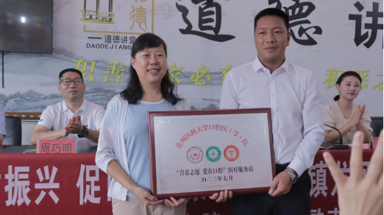 仪式上,张军梅、唐正龙分别授予撒拉溪镇“青春志愿 爱在口腔”医疗服务站及贵医口腔老员工社会实践基地牌匾。