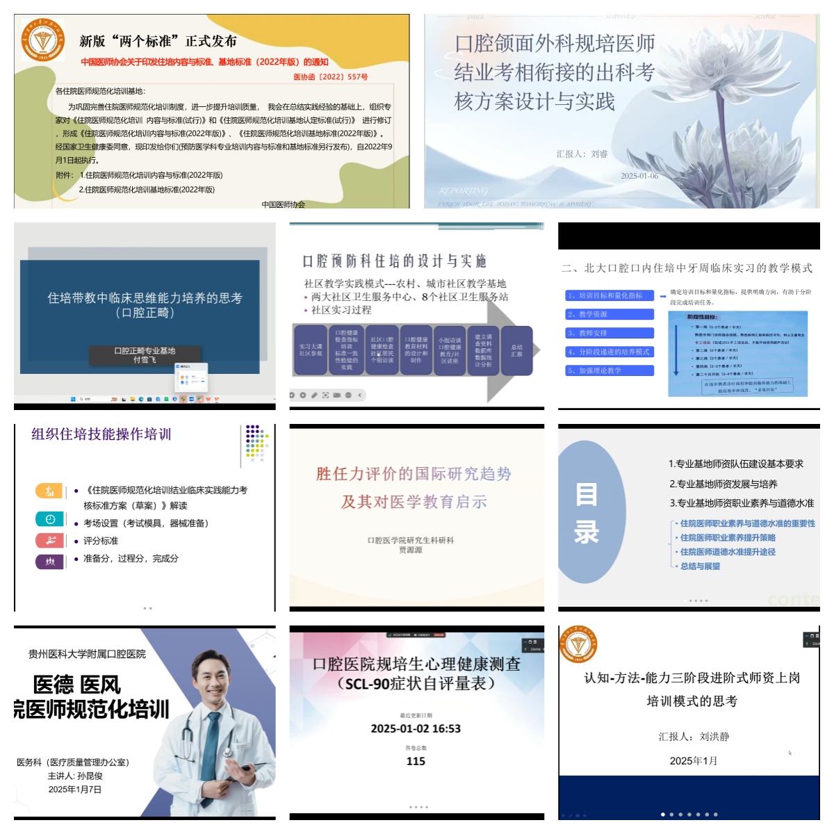 1月6日下午至1月7日,培训转到线上进行,分别由口腔种植修复科专业基地教学主任田艾、口腔颌面外科专业基地教学主任刘睿、牙体牙髓科主任谭旭、儿童口腔科主任卢虹、医务科副科长孙昆俊、口腔全科专业基地教学主任宋彦蓉、口腔内科指导医师王婷婷和张玲艳、口腔正畸科专业基地教学主任付雪飞、研究生科研管理科负责人贾源源、口腔全科专业基地负责人刘洪静依次授课,围绕医德医风、团队职业素养、技能培训、临床思维能力培养、出科考核设计、日常考核等内容深入讲解。大家纷纷表示受益匪浅,对最新的政策要求有了新的认识。