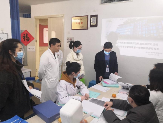 根据省卫健委《关于做好贵州省住院医师规范化培训过程考核的补充通知》等要求,为保证我省住培工作健康有序开展,4月1日下午,由副经理唐正龙、毕业后医学教育管理科科长廖健、各专业基地负责人组成结业过程复核专家组,到医院各专业基地办公室开展2022年结业过程考核复核暨第一季度院级督导检查工作,各专业基地教学主任及教学秘书等陪同检查。