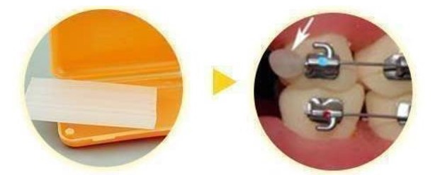 (2) 钢丝扎嘴(结扎丝与弓丝):若为结扎丝扎嘴,可以采用圆钝物体比如筷子、铅笔头等将结扎丝重新压到弓丝的下方,操作过程中力量不要过大,避免托槽松动脱落。若为主弓丝扎嘴,则建议使用粘膜保护蜡或口香糖包裹扎嘴部位(如上图所示)。