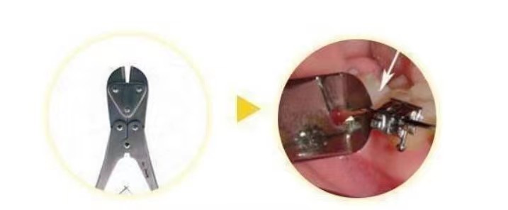 (1) 钢丝滑出:①用镊子夹住弓丝将弓丝向滑出相反方向轻微移动将其复位。②若无法复位,则使用粘膜保护蜡或口香糖包裹末端防止扎嘴。③可使用剪刀或细头钳子剪断长出的弓丝。