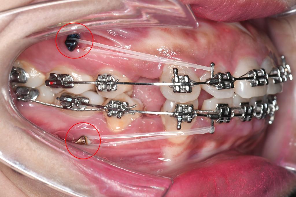(5)种植钉松动脱落:若种植钉已松动,暂停橡皮筋牵引,如果种植钉松动度过大或种植钉部位持续疼痛,患者可尝试逆时针轻轻旋转取出种植钉,种植钉取出后,可辅助使用漱口水维持口腔卫生。这里需要注意的是,若为双侧种植钉,一侧松动脱落,无法进行牵引,则另一侧同样也暂停牵引。