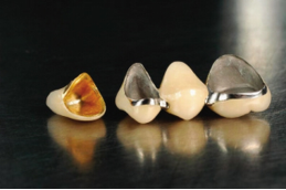 金合金烤瓷冠是贵金属系列烤瓷冠的代表,依据金的含量分为中金(56.7%)、高金(86.7%)两种,是理想的修复材料之一。它克服了钴铬合金烤瓷冠等非贵金属烤瓷冠的缺点,金瓷结合牢固,不易产生崩瓷现象;生物相容性好,不易出现牙龈变黑等现象;几乎不影响核磁共振检查;易加工,能够与基牙边缘结合紧密,避免微缝隙。价格较高,美容性较钴铬合金烤瓷冠高,比全瓷冠低。