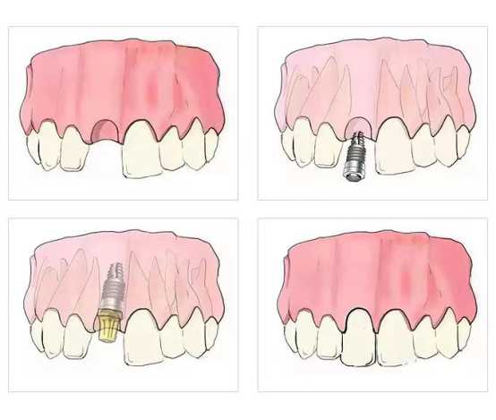 种植义齿就是将纯钛金属的螺丝(一般称做种植体)植入牙槽骨内。根据患者失牙后牙槽骨及颌骨的变化,选用合适的种植体植入颌骨内作为人造牙根,起支持固位作用。在其露出口腔内的种植桩上安装牙冠,承担咀嚼作用,获得与自体牙相似的形态及功能。