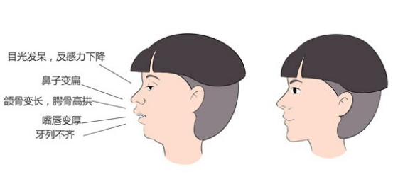 在临床中,我们会遇见本应该退缩的腺样体因为在儿童时期感染发炎而导致肥大,这称为腺样体肥大。肥大的腺样体,向前可以阻塞鼻腔通道,向两侧发展可以阻塞咽鼓管的咽口。孩子被迫张口呼吸,这就增大了呼吸道感染的可能性,当有扁桃体肥大时,引起舌咽段狭窄,孩子会代偿性前伸下颌骨,以寻得气道通畅,形成功能性Ⅲ类错颌畸形,长久以往将发展为骨性Ⅲ类高角面型。也就是我们常说的地包天。