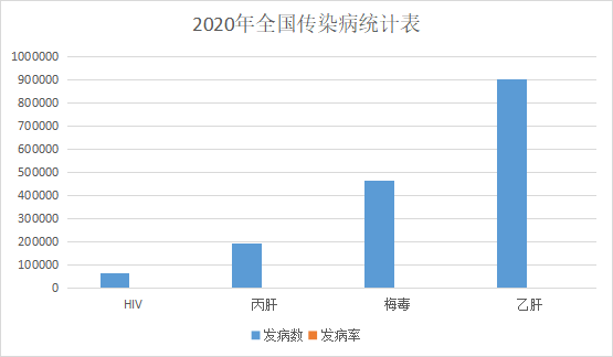 传染病包括HIV、梅毒、丙肝、乙肝都是非常普遍的、极具传染性的传染病。如下图所示,仅2020年这一整年的全国传染病数据统计,HIV确诊数为62167例、梅毒确诊数为464435例、丙肝确诊数为194066例、乙肝确诊数为902467例,全国仍有30万到50万感染者未被发现,数字触目惊心!!!