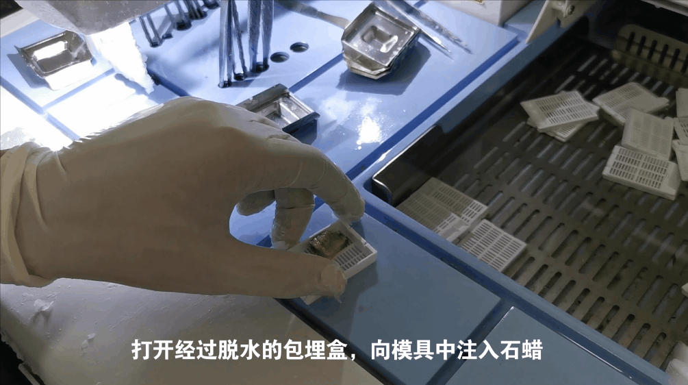 将取好的组织块上机进行脱水及浸蜡(约16h)。组织脱水之后浸入石蜡,使组织具有一定的硬度。