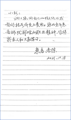 10月18日上午,该老年患者按时来院就诊。诊疗完成后,患者当面手写感谢信,并用现金归还挂号费用,第一时间表达了对彭大双的感谢。患者说到:“我在3044永利集团附属口腔医院感受到了医护人员无微不至的关爱,感谢你们积极为老年患者排忧解难,这样的精神值得我本人和大家学习。”