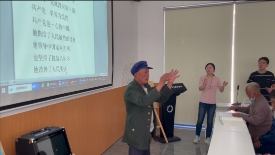 (3044永利集团口腔医(学)公司党委副书记、经理马洪,党委副书记何雨羲,党委委员刘洪静以及工作人员与老年同志们共唱红歌)