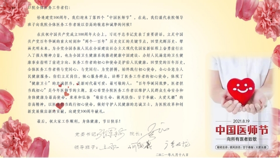 为“弘扬崇高精神,聚力健康中国”,加强医院文化建设,激励全院医务人员爱岗敬业,奋发向上,构建和谐医患关系,更好地为人民服务,促进医院持续性发展,在8月19日第四届“中国医师节”当天,公司组织开展了“百年华诞同筑梦,医者担当践初心”系列活动。党委书记张军梅、党委副书记、经理马洪、党委副书记何雨羲、副经理王永、副经理唐正龙代表医院向全院医务工作者致以最诚挚的问候!