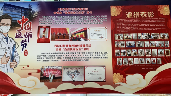活动前,医院医务科精心组织策划,在全院临床一线科室范围内评选出11名优秀医师,形成“优秀医师”壁报;将获得贵州省“优秀党务工作者”的张军梅同志、获得2020年全省“百名优秀医生”称号的廖健医生,以及获得“优秀医师”称号的王永、蔡扬、卢虹、胡赟、吴睿、黄时富、陈萍、李毓勤、帅宾宾医师的个人先进事迹形成“学先进 树典型”壁报在医院二楼大厅展示,用于弘扬口院医师“医德高尚、仁心仁术”的精神风貌。