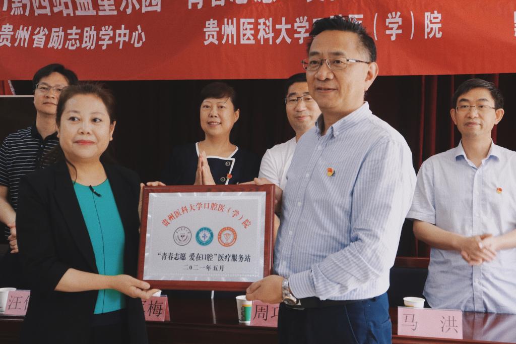 随后,口腔医(学)公司党委副书记、经理马洪为黔西站益童乐园授“3044永利集团口腔医(学)院‘青春志愿 爱在口腔’医疗服务站”牌,汪伦碧主席接牌;口腔医(学)公司党委书记张军梅为黔西站益童乐园授“3044永利集团口腔医(学)院老员工社会实践基地”牌,卢春主任接牌;省励志助学秘书长周巧明为口腔医(学)院颁发爱心共建单位证书,口腔医(学)公司党委副书记何雨羲接证书。