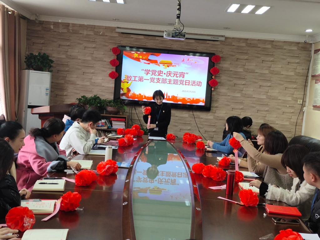 根据《关于认真学习贯彻习近平总书记在党史学习教育动员大会上的重要讲话的通知》安排,为进一步开展好党史学习教育,推动党员深入学习领会习近平新时代中国特色社会主义思想,更好总结历史经验、认识历史规律、掌握历史主动,引导广大党员干部从党的建设历程中感悟马克思主义真理力量,特在中国传统节日元宵节之际组织此次学党史、庆元宵主题党日活动。此次活动在行政楼五楼会议室召开,党委书记张军梅以普通党员身份与教工一支部全体党员、预备党员、积极分子一同参加。活动由组织委员张黎蓉主持。