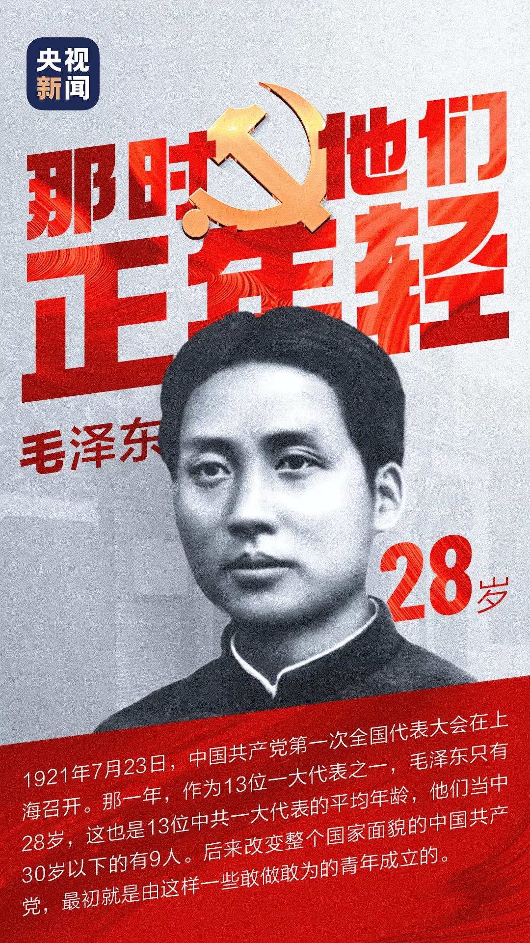 1921年7月23日,中国共产党第一次全国代表大会在上海秘密召开,那时,毛泽东28岁,正好是13位中共一大代表的平均年龄。