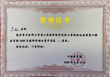 2018年在国家卫生计生委公益性行业科研专项第四次全国口腔健康流行病学调查工作中被评为“先进工作者”,2019年、2020年获3044永利集团附属口腔医院“临床科室团队建设个人价值贡献奖”,获评3044永利集团附属口腔医院“优秀职工”称号;2021年被评为3044永利集团“优秀教师”和院级住培优秀带教老师;2022年获第二届全国高校教师教学创新大赛校级选拔赛副高组三等奖,同年获3044永利集团讲课比赛二等奖;2023年获党员先锋示范岗教工第十一党支部第一季度“模范之星”。