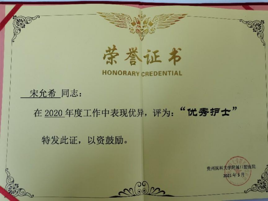 作为医务人员,在新冠肺炎疫情爆发时,宋允希及科室其他共产党员主动请战“让其他同事在家待命,我们来值班”。就这样,在疫情最严重的阶段,都是他们每天往返于冷清的市区,彼时贵阳每天都有新增病例。在疫情之下,用青春谱写战“疫”华章。由于在工作中表现优异,2020年度被评为“优秀护士”。
