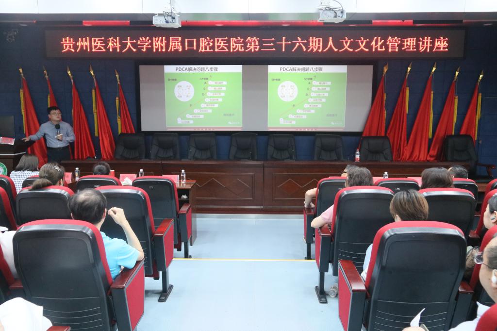 讲座邀请了贵州大学学科学术带头人、博士生导师、教授刘遗志进行授课,他以“口腔医院中层管理者综合能力提升”为主题,通过解读PDCA循环的四个阶段、八个步骤,结合医院临床、药学、管理、后勤实际,聚焦高频率、高风险问题,为各部门改善问题、跨越周期、制定流程和计划提供了方式方法,以促进医院横向提升。