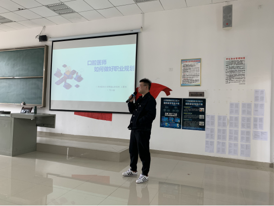 韦小超剖析了口腔医学专业的前景,主要从“职业规划、为什么要做职业规划、如何做好职业规划、本科口腔医师职业规划”四方面进行宣讲,并以“在校期间的学习、实习、就业择业规划”为切入点进一步明确老员工职业定位的重要性,帮助同学们具体分析口腔医学行业现状、招聘要求及福利待遇,希望同学们在今后的岗位上能激情不断,发光发热,收获成功。