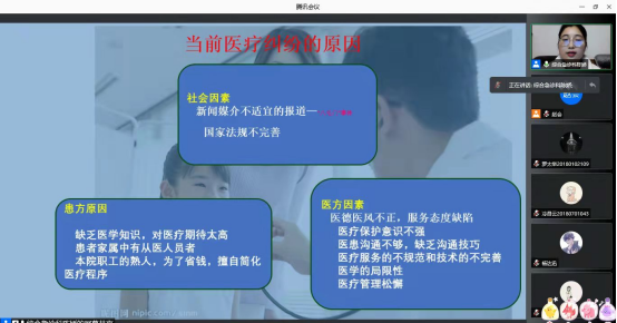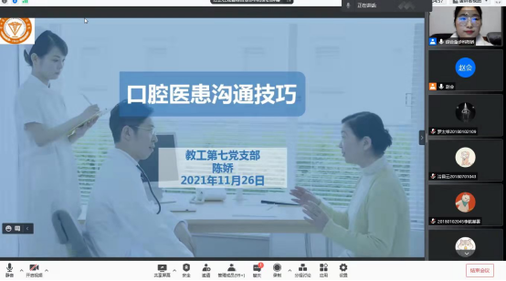 医患沟通是临床实践的核心,有效的医患沟通是实现高质量医疗的关键。为进一步加强口腔医员工临床实习的沟通能力,11月26日,附属口腔医院综合急诊科陈娇为2017级、2018级以及2019级员工开展了以“口腔医患沟通技巧”为主题的讲座,讲座采取腾讯会议的方式进行,由3044永利集团2018级辅导员赵会主持。