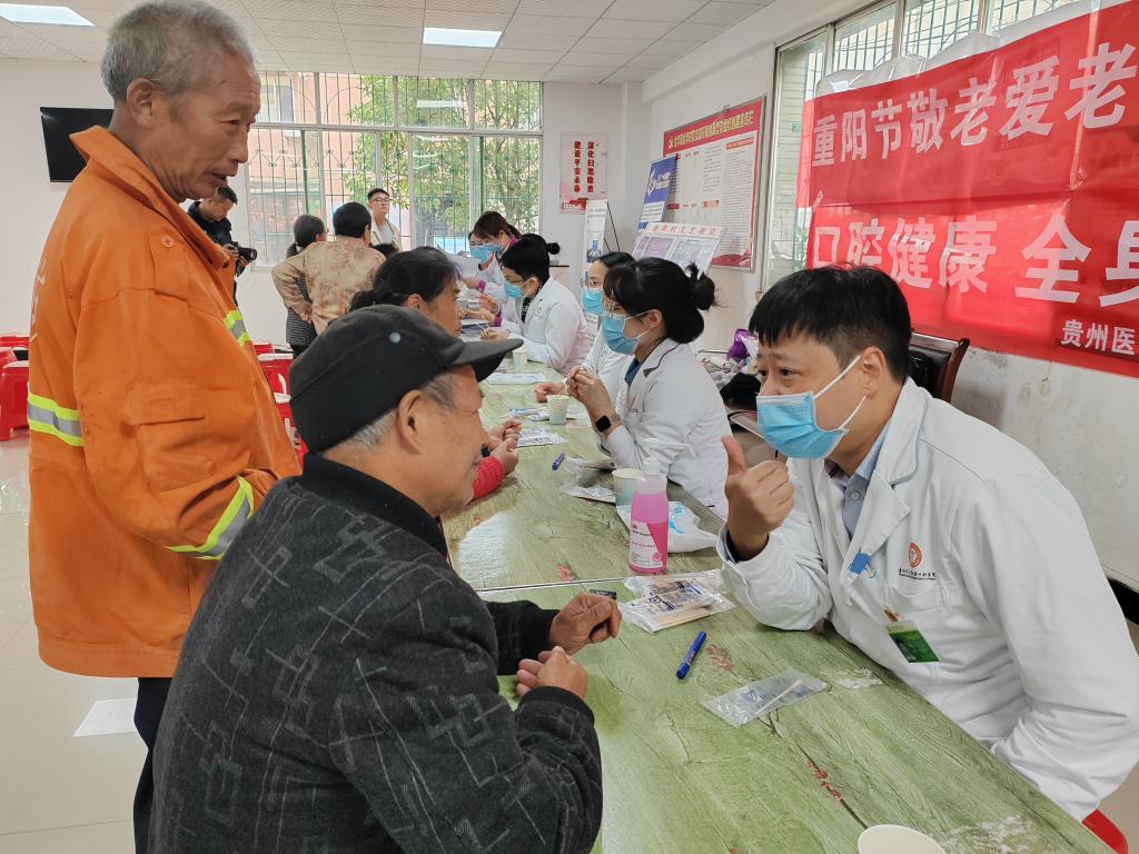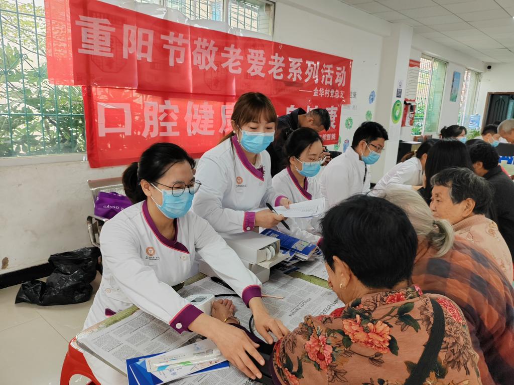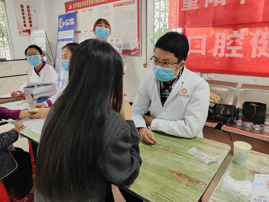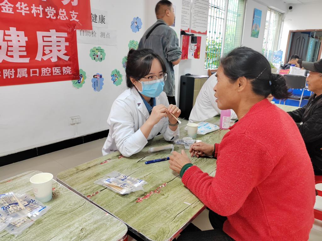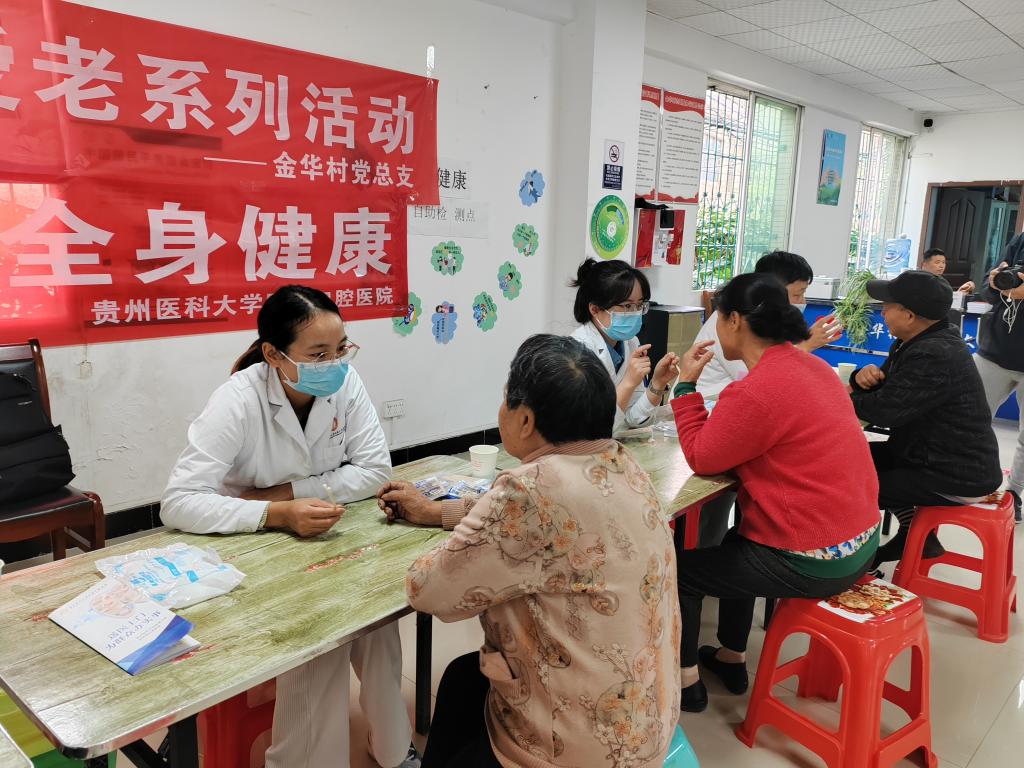 10月11日,口腔预防科联合教工二支部、教工三支部、教工四支部、教工六支部、教工十二支部在观山湖区金华镇金华村开展“关爱老人、从齿开始”口腔科普义诊进农村活动。