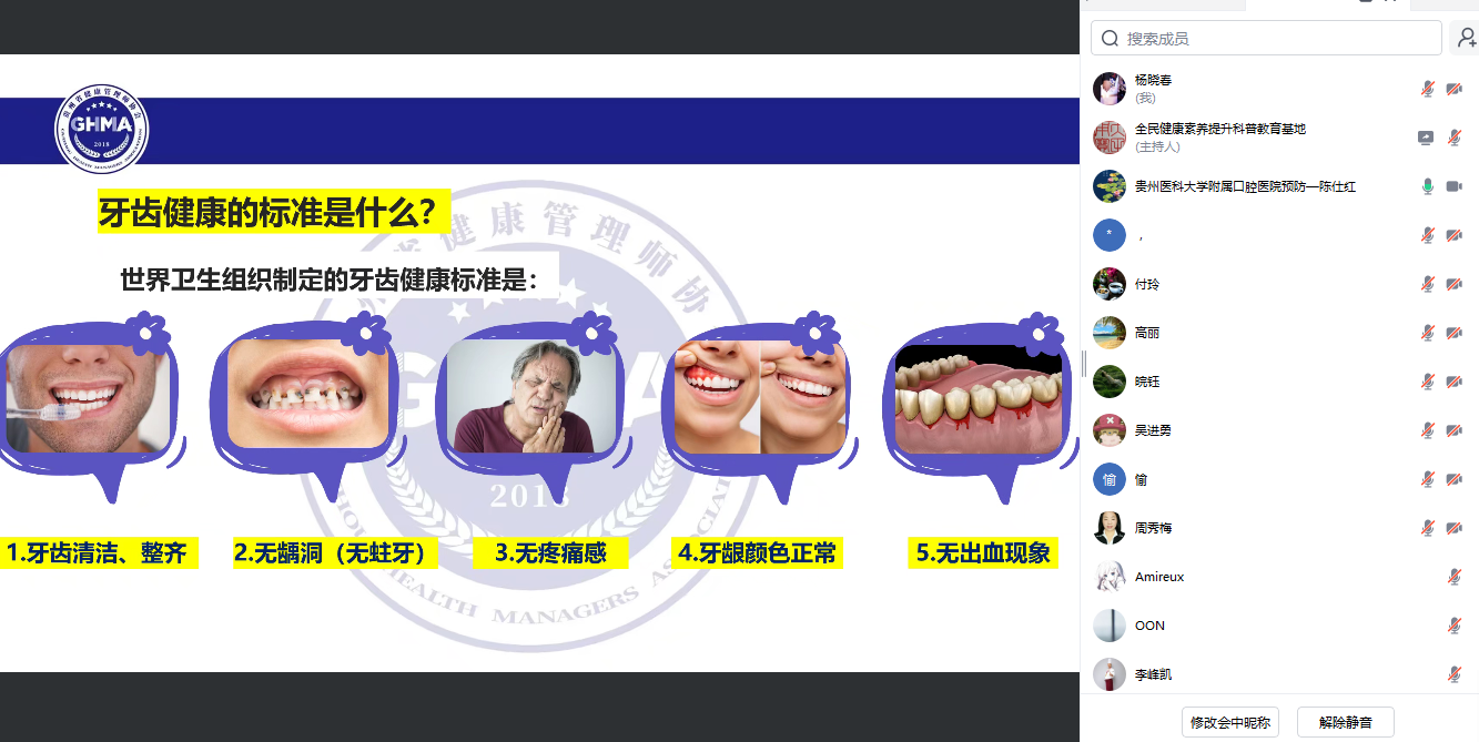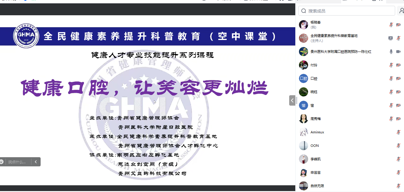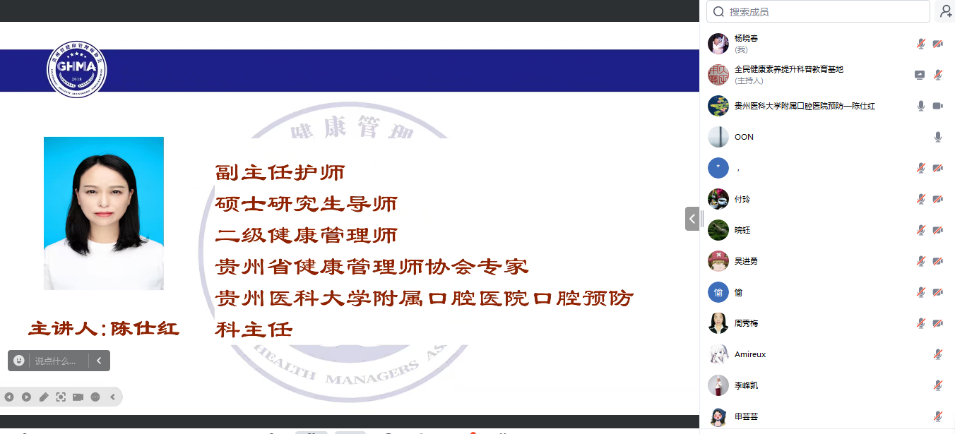 为提升全民健康素养,加强健康人才专业技能,12月19日,公司与贵州省健康管理师协会联合举办了全民健康素养提升科普教育空中课堂,此次授课由公司口腔预防科主任陈仕红主讲。