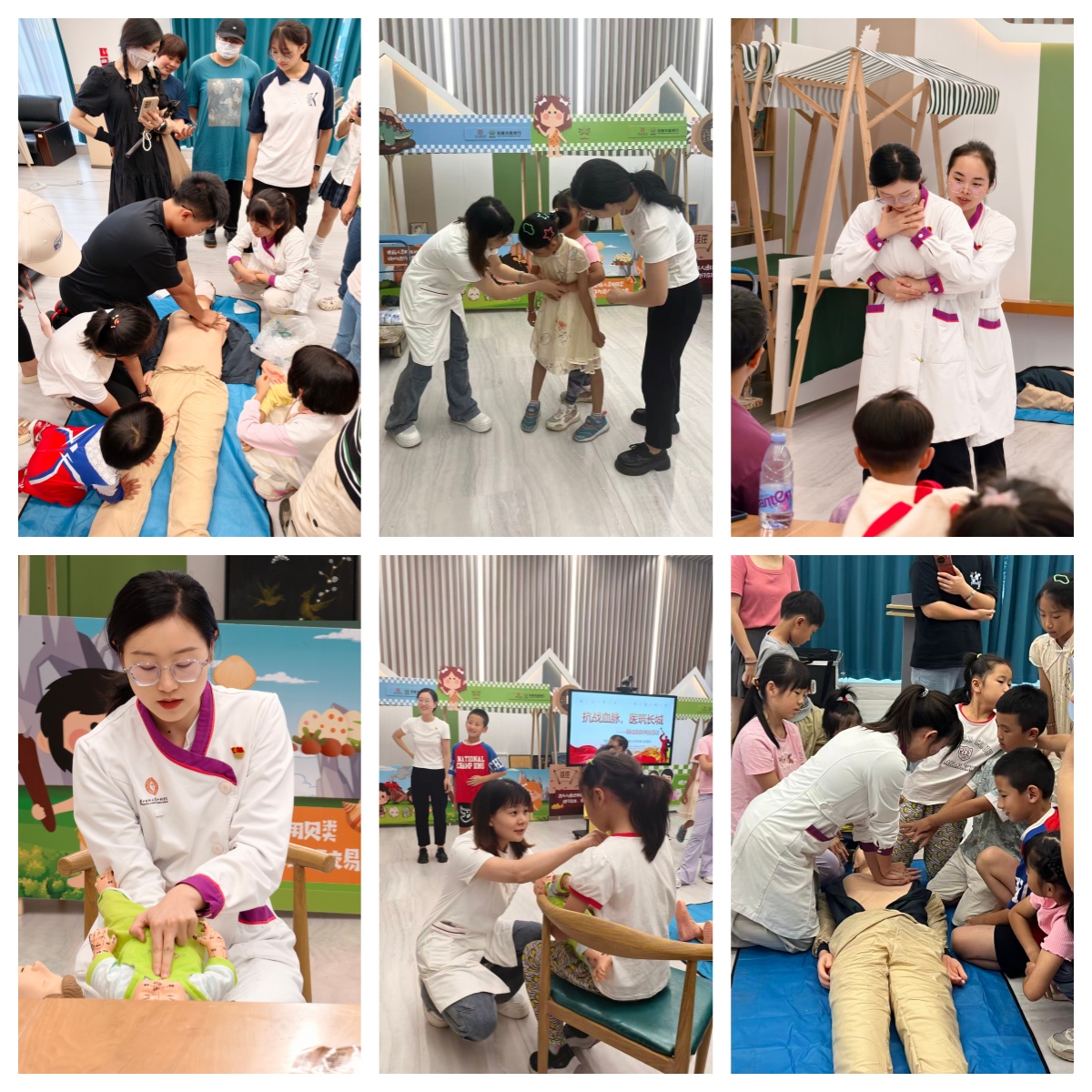 实操环节中,张聪颖、董银银、袁榕、严礼四位医护人员分组指导参与者进行CPR和海姆立克法的模拟练习,现场互动积极、气氛热烈。