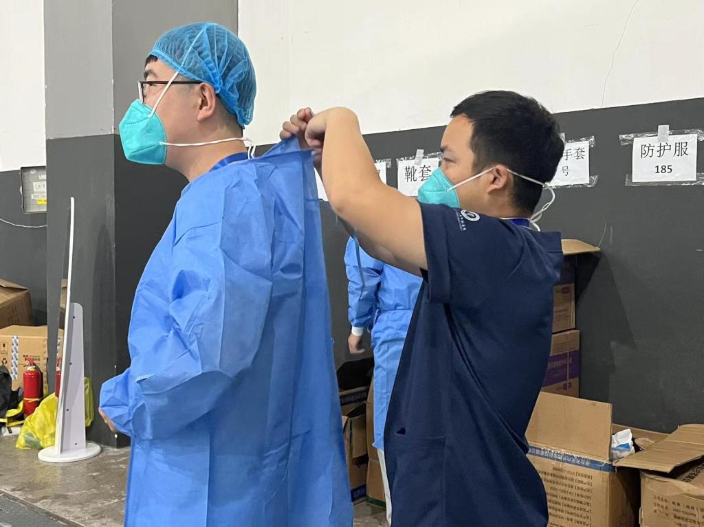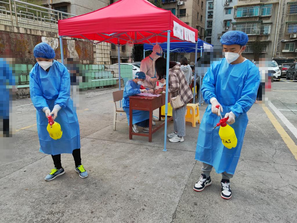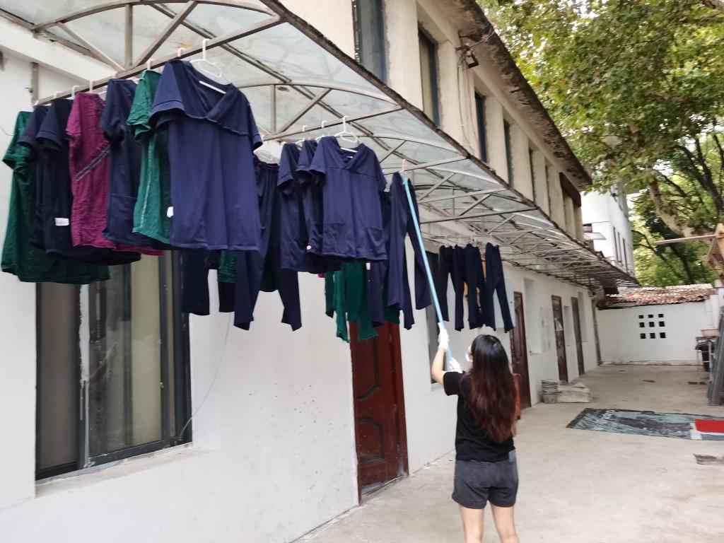 作为医员工,口院住培生主动践行志愿者精神,展现住培生担当,疫情期间有28名住培学员充分发挥自身优势,在认真学习口罩、防护服的规范穿戴及杀菌消毒等相关知识后,积极投入到疫情防控一线。在核酸检测现场,住培学员们积极奉献、敢于担当,用实践书写着新时代青年的责任与担当。除一线的志愿者外,后方还有默默无闻为疫情防控工作人员提供生活保障的后勤服务小组,每天对核酸采集队员的衣物进行消毒、清洗、晾晒,确保换洗衣物的正常供应,他们默默无闻为疫情防控工作提供着有力支持,成为了时刻守护在群众身边的“志愿红”。
