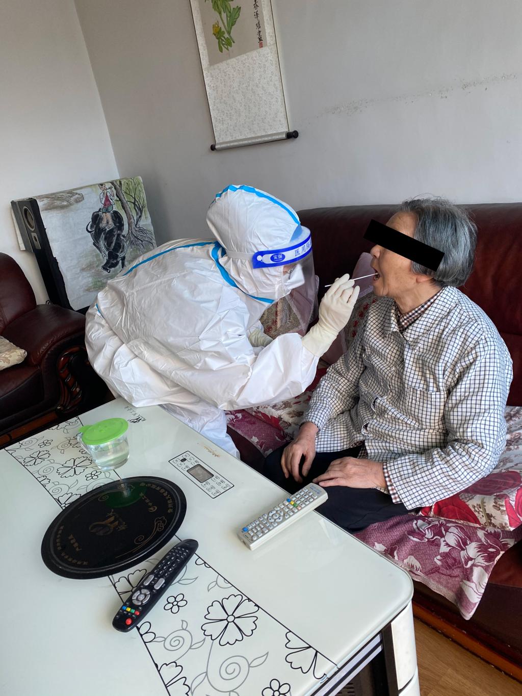 8时50分,核酸采集小队正式开始对盐务街社区行动不便及老弱病残等特殊人群进行核酸采样,切实保障全员核酸检测不漏一户、不落一人。其中,有老人76岁,因有多项基础疾病,腰肌劳损造成走路困难,不便出门。核酸采集小队在社区工作人员带领下,来到老人家中,仅用了几分钟就完成了核酸采集。随后,她们陆续前往辖区其他行动不便的居民家中,帮助登记信息,进行咽拭子标本采集,圆满地完成了这次核酸采样任务。经统计,此次共计完成核酸采集57人次,上门服务46家。