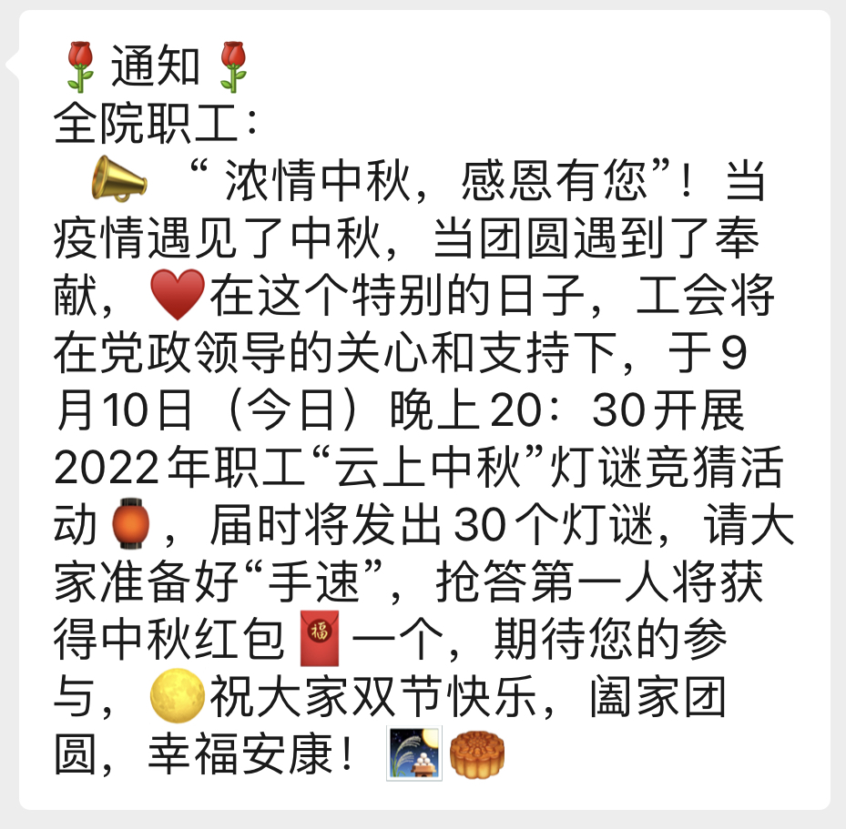 除此之外,在党政领导的关心下工会组织开展了“浓情中秋,感恩有您!2022年职工‘云上中秋’”灯谜竞猜活动。全院职工在线上积极发言竞猜灯谜,开心的氛围把活动推向高潮,反响热烈,活动在大家互道祝福声中圆满结束。纷纷表示今年的“中秋”在医院这个大家庭里度过了一次温馨难忘的节日。