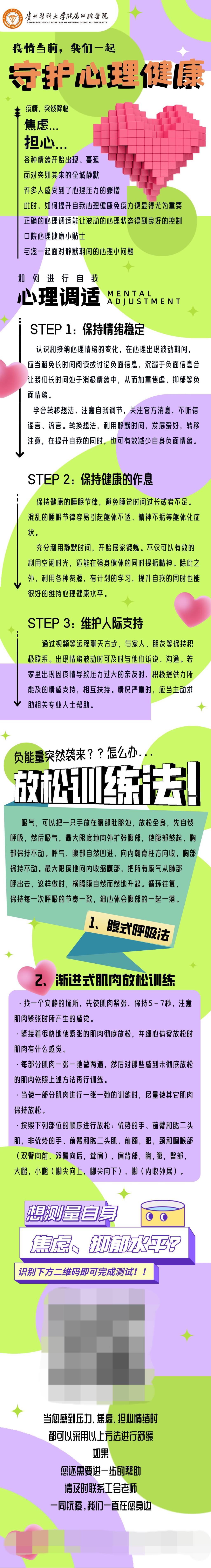 在了解职工的问题及诉求同时,职工心理健康问题也不容忽视。突如其来的疫情让大家的生活发生了翻天覆地的变化,无论是工作生活还是精神都在经历着较大的起伏。在这特殊的时期,为保障全院职工心理健康水平,工会特别制作了“守护心理健康”小贴士供大家参考,为保障口院职工心理健康做出努力。