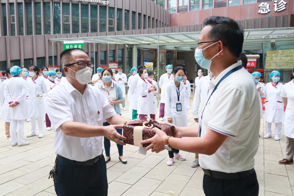 慰问期间,校领导为职工代表送上节日礼物,并与他们亲切交谈,深入了解疫情防控、医教研、生活等情况。指出一线防疫人员是抗击疫情期间的攻坚力量,叮嘱他们在奋战一线、坚守岗位的同时千万做好个人防护,用心用情用爱守护校园、医院安全稳定,耐心维护员工身心健康,众志成城打赢这场疫情防控阻击战。
