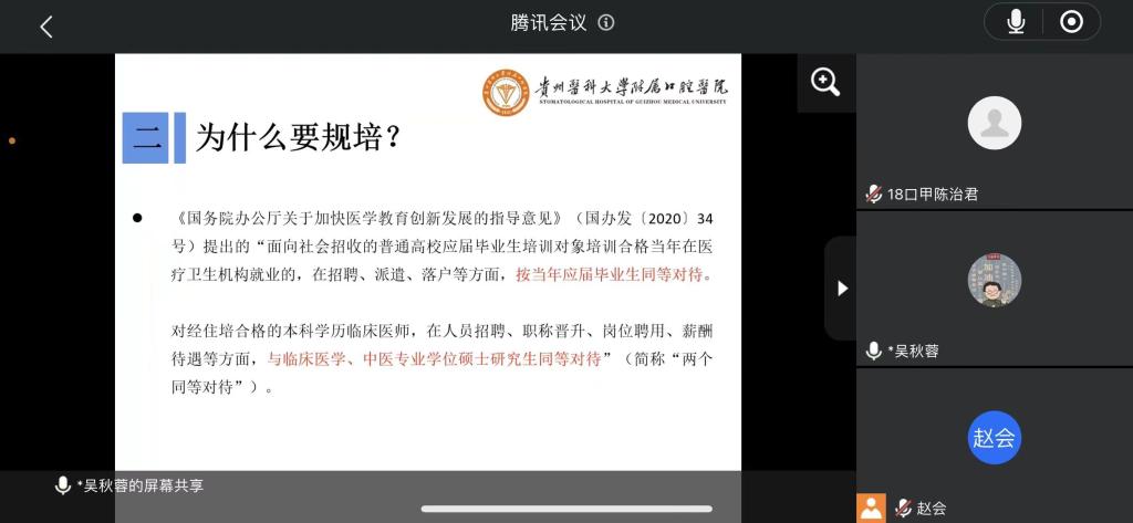 吴秋蓉从“什么是规培”“为什么要规培”“报名考试流程”“省内外招考信息”等四个方面详细介绍了规培的基本概念、相关政策、招考流程、近几年招考信息,与同学们亲切互动,耐心答疑解惑。她强调,每个省份、每个规培基地每年招收规培生的时间、考察的内容有所差异,同学们要积极主动收集规培信息,多了解、多选择、多报考、多尝试,把握现在、决胜未来。会上,赵会为实习同学进行口腔医学专业认证应知应会手册培训,对大家提出的问题进行详细讲解,要求全体员工高度重视、认真准备,全院师生一条心,助力专业认证。